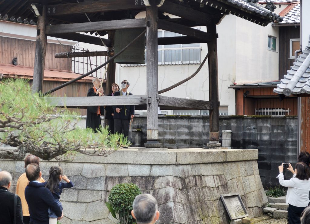 法要後は境内に移動し、今秋に県内寺院より譲り受けた梵鐘を数回つき、供出以来約80年ぶりに鐘の音が響きました。とても良い音色でありました。
