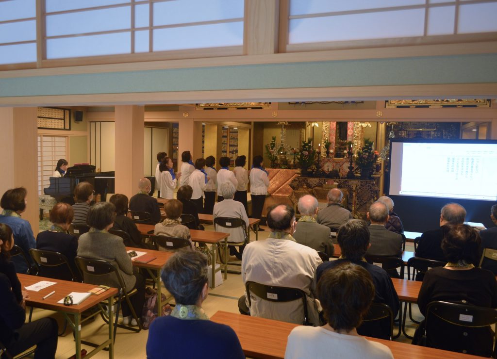 翌2日は午前10時30分より、この日も近隣ご寺院さまとご門徒と共に「阿弥陀経作法」をおつとめ、引き続き女性コーラス皆さまによる仏教讃歌、最後に住職より法話、及びこのたびの梵鐘譲受の報告をおこないました。